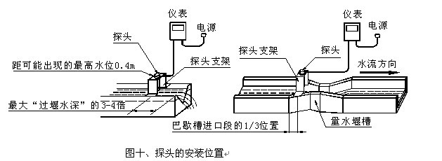探頭在渠道上的安裝位置要符合量水堰槽的要求。一般三角堰、矩形堰要安裝在堰板上游,距離堰板相當于最大過堰水深的3~4倍(最大過堰水深是指,流量剛好等于零時液位為零,流量增到最大時對應(yīng)的液位);巴歇爾槽在進口收縮段的1/3位置(參見圖十)。