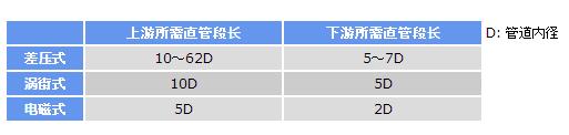 調(diào)整流量計的流速分布所需的直管段長度大致如下表所示: