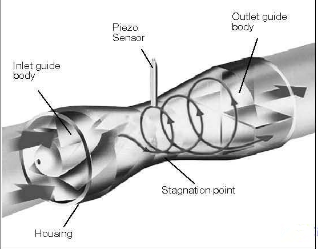 當(dāng)流體通過由螺旋形葉片組成的旋渦發(fā)生器(見圖1)后,流體被迫繞著發(fā)生體軸劇烈旋轉(zhuǎn),形成旋渦。當(dāng)流體進(jìn)入擴(kuò)散段時(shí),旋渦流受到回流的作用,開始作二次旋轉(zhuǎn),形成陀螺式的渦流進(jìn)動(dòng)現(xiàn)象。該進(jìn)動(dòng)頻率與流量大小成正比,不受流體物理性質(zhì)和密度的影響。檢測元件測得流體二次旋轉(zhuǎn)進(jìn)動(dòng)頻率,就知道了流量。而且能在較寬的流量范圍內(nèi)獲得良好的線性度。