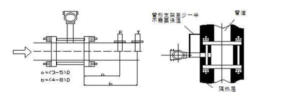 為了確保儀表正常、準確運行,傳感器安裝點的上下游必須有一定的直管道,以調(diào)整流場,如圖所示。