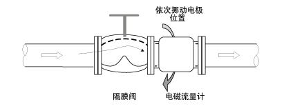 即使平時(shí)將隔膜閥要打開使用,也會(huì)由于流速分布不均使電磁流量計(jì)產(chǎn)生幾個(gè)百分點(diǎn)的誤差。把電磁流量計(jì)安裝至閥門的上游可以解決問題,但是由于過程運(yùn)行上不允許這樣做,所以利用電磁流量計(jì)的安裝螺孔,依次挪動(dòng)電較位置,找到一個(gè)可以獲得較接近理論流量值的位置(如下圖),便解決了問題。