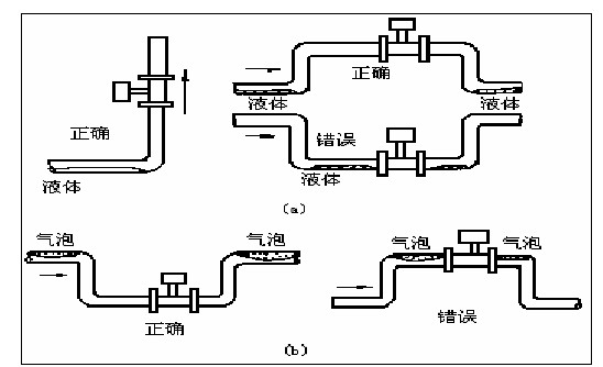 7. 測量液體時,為了保證管內(nèi)充滿液體,所以在垂直或傾斜管道安裝儀表時,應(yīng)該保證液體流動方向從下而上。若管道內(nèi)含少量氣體,為了防止氣體進(jìn)入儀表測量管,儀表應(yīng)安裝在管線的較低處。如圖(二)b所示